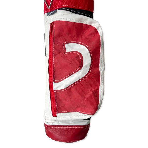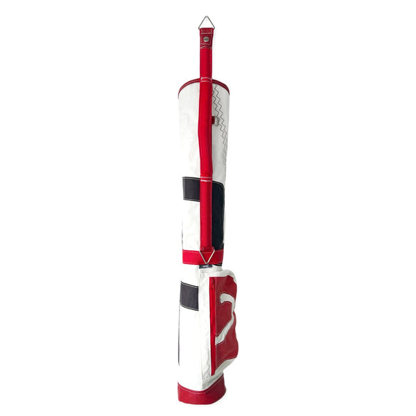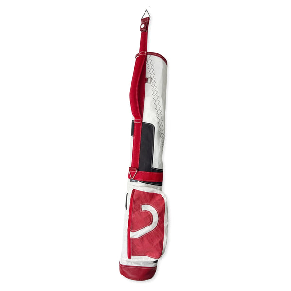- 100% reclaimed sail bag and trimmed with genuine weathered red leather and red webbing. (includes matching sail/ leather strap).